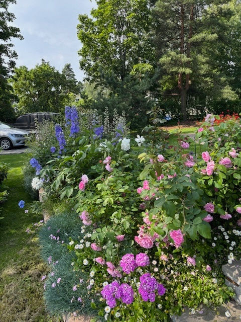 Asukkaiden toiveissa oli englantilaisia Cottage garden-tyylisiä runsaita kukkapenkkejä, joissa hallitseva värimaailma olisi vaaleanpunainen-violetti-valkoinen ja sininen. Huolellisilla kasvivalinnoilla kukkapenkit ovat nyt runsaita, reheviä ja kukkivat varhaisesta keväästä myöhäiseen syksyyn tuoden sitä kaivattua englantilaista charmia.